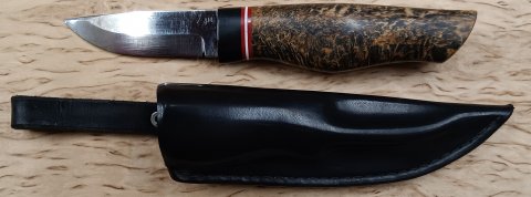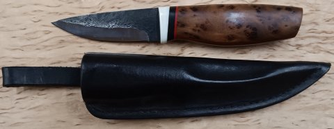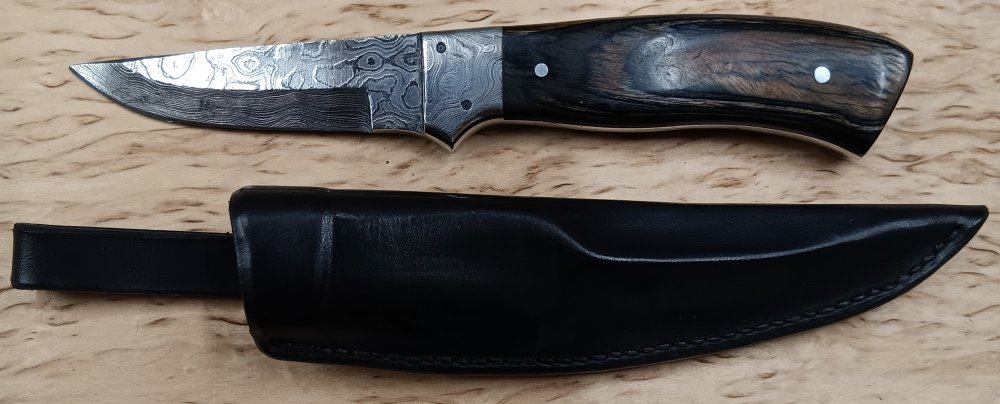 Jagtkniv med mønstret kulstofstål klinge og bolster
