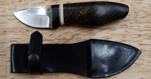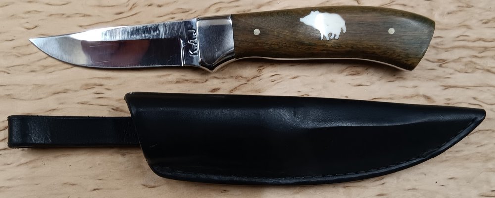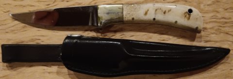 Flåkniv med rustfast stålklinge, bøffelhorn, kamelben tin,