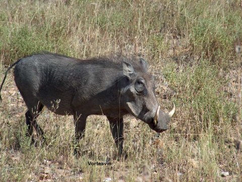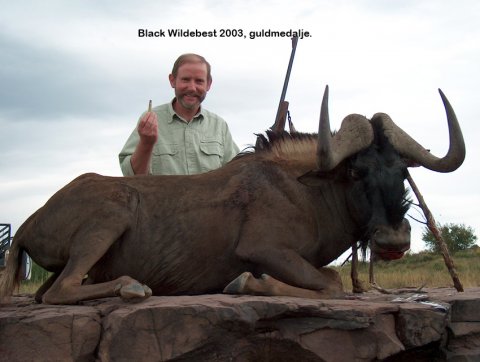 Højst på listen over trofæerne stod Kuduen. Den vandrer frem og tilbage mellem bjergene og floden. Så det var tidlig op om morgenen og køre 25 km for at komme på plads og vente på den. Vi så små kuduer, men ingen der var på skudhold eller store nok. Jeg var af sted 5 morgner uden resultat, kun oplevelsen af naturen, som var store slående, bjergskildpadde, bavianer m. fl.. Som alternativ til Kuduen kunne jeg prøve at få en Black Wilderbeest. Sidste jagtdag om eftermiddagen tog Jonie og jeg ud til en nabo, hvor han havde tilladelse til at jage. Dyrene var meget vilde. Her stod tyrene også for sig selv og markerede territorium. Jonie forstod også, som Robbie, at lægge en plan og få det til at lykkes. Vi satte os i skjul af nogle buske og trackeren blev sendt ud for at trykke tyren op til os. Det lykkedes perfekt. Den kom på skudhold, tegnede for en fin bladkugle, men løb trods det 170 m før den væltede i buskene 30 m foran os. Black Wildebeest kaldes på dansk hvidhalet gnu. Den blev af hunteren kaldt fattig mands bøffel. Det kan jeg godt forstå, den kunne godt være farlig, hvis den blev anskudt, og så koster den kun en brøkdel at nedlægge.