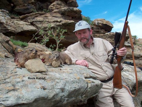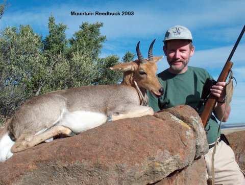 Vi gik videre. Efter lidt tid opdager Robbie en på den modsatte bjergside delvis skjult af en busk ude på måske 400 m. Jeg kunne ikke se den, så godt faldt den ind i terrænet. Problemet var nu at komme til den, uden at den opdagede os. Vi gik videre og fandt et sted med godt overblik over den lille dal og den modsatte bjergside. Her besluttede vi at blive. Testi vores tracker blev sendt rundt om bjerget for at trykke reedbucken over mod os. Det lykkedes for efter en tid står der pludselig en mountain reedbuck på en klippeblok og kigger ned over dalen på den anden bjergside. Den havde front lige mod os ca. 180 m ude. Robbie viser hvor jeg skal holde på den. Jeg har fast anlæg på en klippeblok, en virkelig god skudchance. Der lyder et klik. Jeg havde ikke fået en patron op i kammeret. Jeg skynder mig at lade. Bucken bliver stående som en anden konge og ser ud over sit rige og aner ingen uråd. Den tegner fint, ramt i brystet og vælter om på siden. En pæn buck. Her er der ikke mulighed for at udvælge størrelse som med springbuck. Her må man tage de chancer der gives. Jeg var allerede nu imponeret over Robbies evner som professionel hunter. Han havde den første dag vist , hvor godt han kendte terrænet og vildtet, hvordan situationerne skulle skæres, for at få et resultat. Første dag og vi havde begge nedlagt to ud af de 5 antilopper, vi skulle have. Hvad skal vi så lave de sidste par dage, hvis det forsætter sådan, men man skal jo ikke som gammelt ordsprog siger sælge skindet, før bjørnen er skudt.
