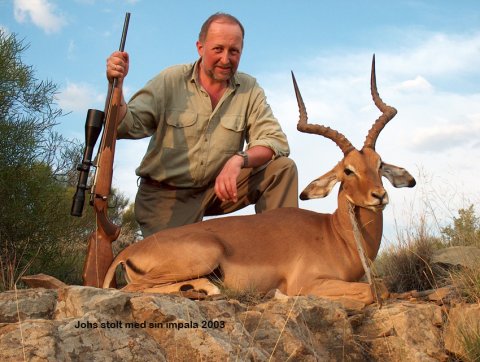 Vi tog ud den anden sidste jagtdag om eftermiddagen. Det viste sig at blive en længere jagt. Ret hurtigt fik vi kontakt med en flok impalaer. Vi kom på rimelig hold af dem, og Robbie pegede den største ud til mig. Da jeg forsøgte at finde den i kikkerten duggede glasset . Det havde småregnet lidt. Dyrene spottede os, og væk var de. De næste 4 timer var opskriften, jeg ved ikke hvor mange gange, at snige sig frem i dække af buskene, undersøge flokken, men inden vi nåede at beslutte os, løb de igen. Flokken var på 10 stykker, så der var 20 øjne og ører til at holde udkig og lytte med. Til sidst lykkedes det. Jeg fik et godt eksemplar. Fotograferingen kunne begynde. Finde et egnet sted i terrænet, få den stillet op og posere som en anden storvildtsjæger, som jeg så tit havde set i jagt bøgerne og drømt om. Nu lykkedes det.