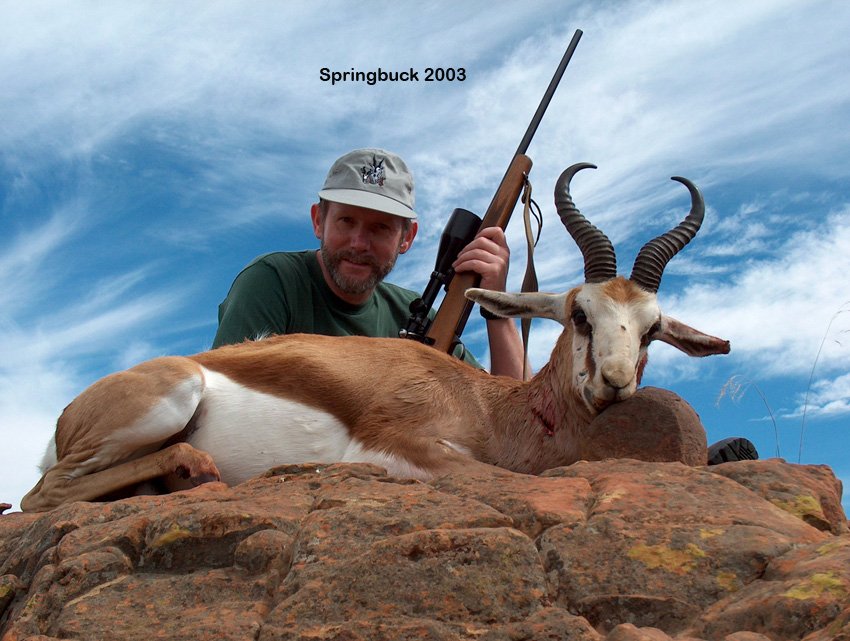 Vi tog til at andet område, hvor springbuckene holdt til. Der var mange. De færdes i store flokke og pludselig springer en af dem lodret i vejret. De territoriel hævdende bukke står alene i terrænet. Robbie studerede de enkelte bukke omhyggelig i kikkerten, inden han besluttede hvilken, vi skulle prøve at komme på skudhold af. Det gik forholdsvis let. Jeg fandt en klippeblok at tage fast anlæg på. Jeg fik hurtigt hold på bukken gennem kikkerten og trykkede. Den tegnede fint. Den gik kun nogle få meter inden den væltede omkuld. Skudafstanden var 200 m. Jeg var inden jagten spændt på at nedlægge vildt ude på store afstande. Vi danskere vil gerne have bukken inden for 100 m. Springbuck vejer 30 kg, altså en halv gang mere end råbukken. Lidt held må man vel også have lov at have. Min første antilope nedlagt uden problemer og man føler sig lidt høj. Over walki talkie erfarede vi at Johs. også havde nedlagt en springbuck. Vi mødtes under skyggen af nogle store træer for at spise frokost i form af sandwich. Det var bare lækkert med en sådan start.