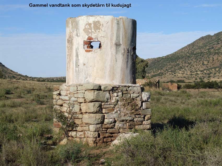 Tidlig morgen kl. 6.00 var vi på plads I en gammelt vandtårn til en gård ruin på Jonies farm need ved floden. Ved syv tiden så vi den første kudu ko. Kuduerne vandrede fra nogle lucerne marker op i bjergene om morgenen og tilbage om aftenen.