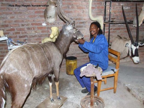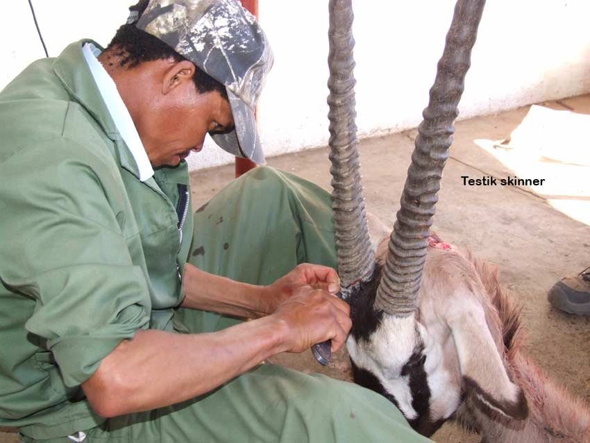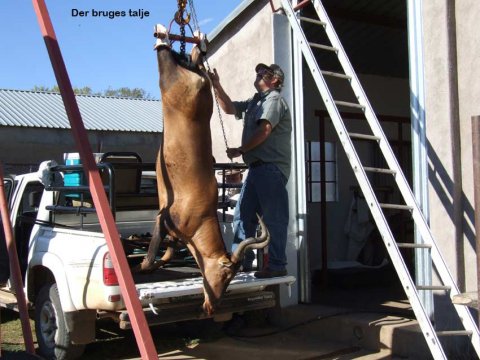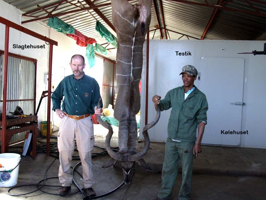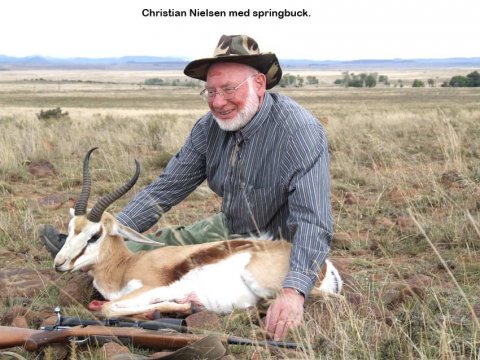 Vi tog ud bag lodgen. Efter en times søgen fik Chr. en chance og dermed sit første bytte nedlagt med riffel – en springbuck.