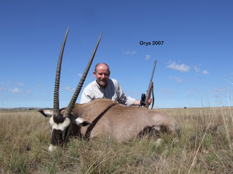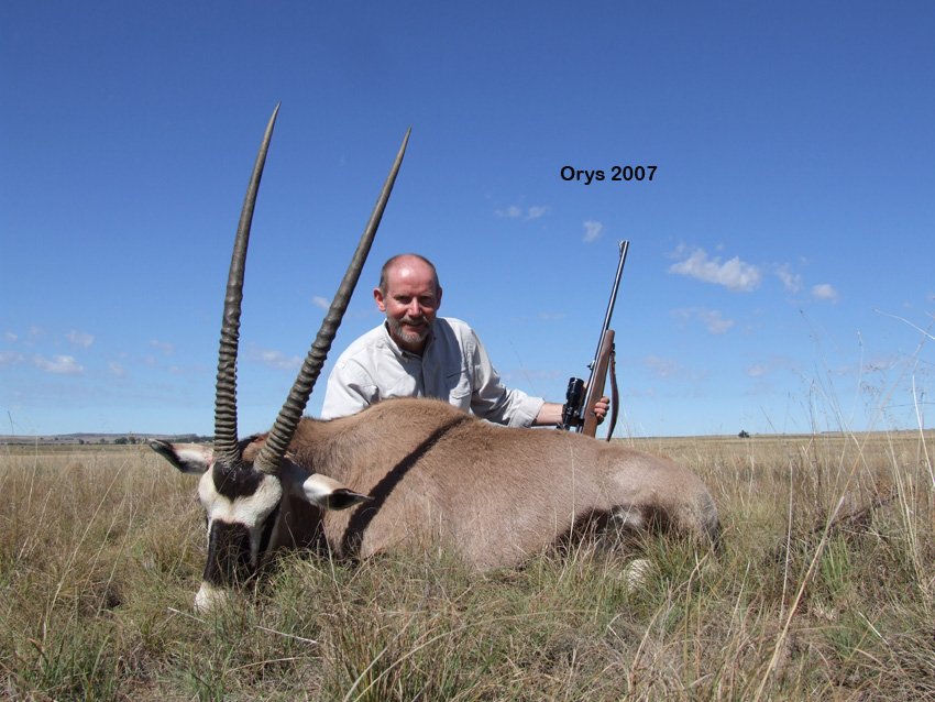 Vi tog ud til Jonie bjerge for at jage oryx. De plejede at gå på det åbne terræn ved bjergets fod. Vi så black og blue wildebes, kudu med flere. Efter et kvarter tid spottede vi dem midt ude i terrænet. Robbie og jeg stod af bilen for at søge skjul lidt højere oppe i terrænet bag noget buskads.