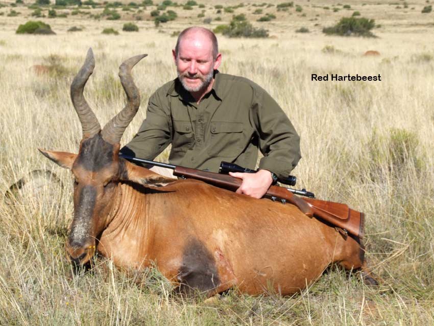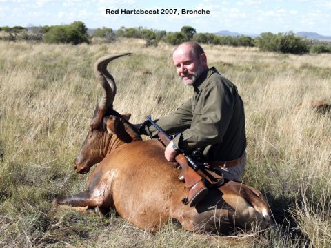 Om eftermiddagen gik vi igen efter red hartebest. Vi fandt hurtigt den lille flok. For at komme på dem med den rigtige vind, måtte vi rundt om et bjerg, og væk var de. Efter en times søgen fandt vi dem igen. Efter en pürsch på 15 – 20 min i noget buskads kom jeg på skudhold på 80 m. Kuglen gik ind foran højre forben og ud bag venstre forben. Den begyndte at gå. Jeg gav den en ekstra kugle og den væltede.