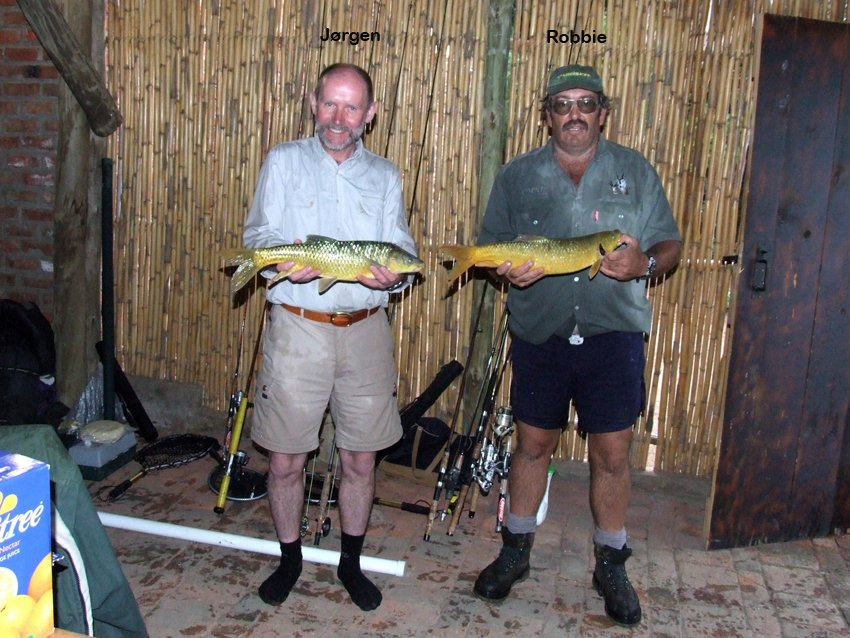 Vi kunne fiske med orm, bait, spinder eller flue. Vi fiskede i floden OrangeRiver. Der var lavet en opdæmning til et vandkraftværk. Vi fiskede efter opdæmningen når sluserne var lukkede. Per og jeg fik hver en kano og sejlede ud i floden. Kalle, Carl Martin og Chr. fiskede fra bredden. Robbie gik rundt ude i floden og fiskede med flue. Vi fiskede i 2 perioder.